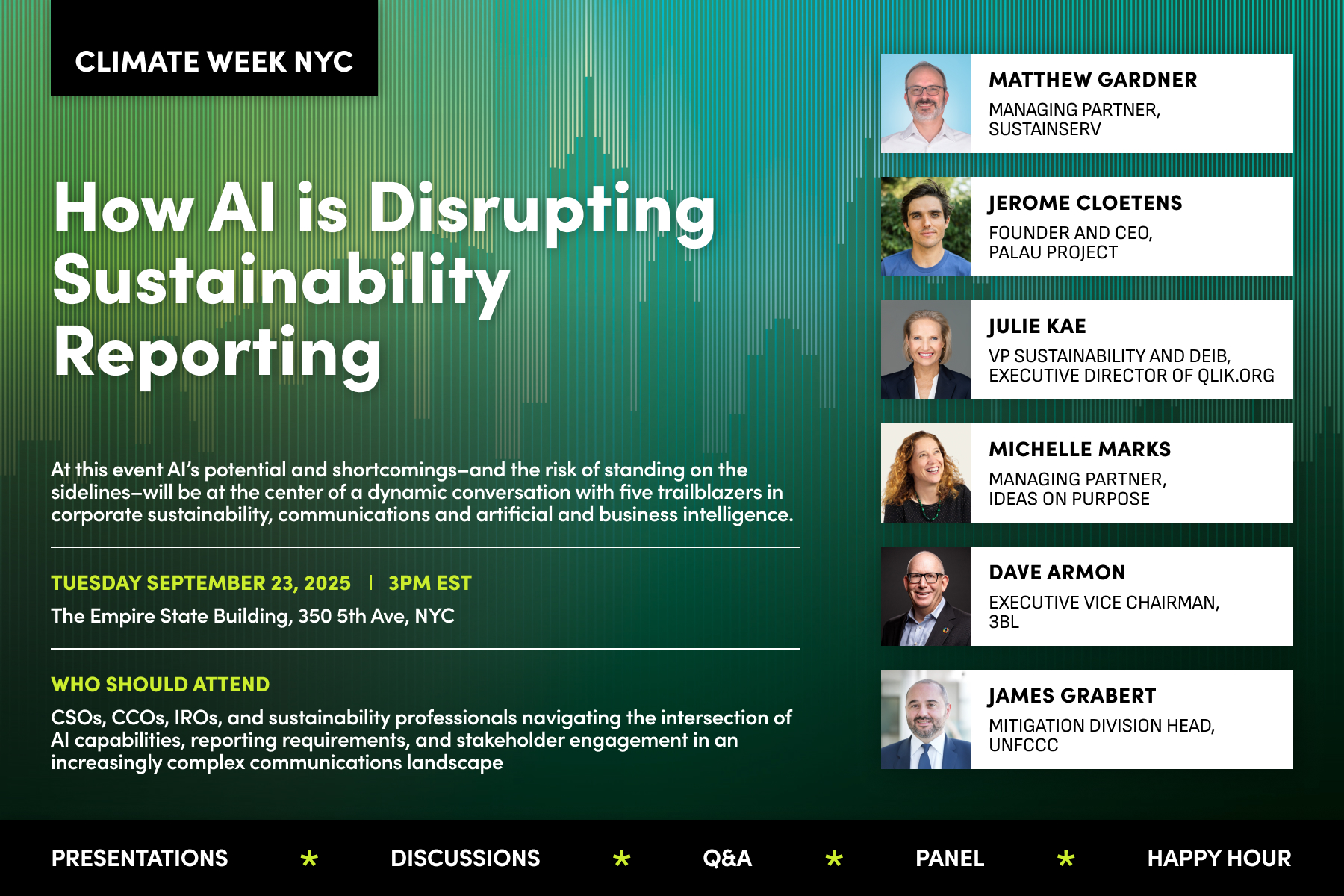 Join us at Qlik’s headquarters in the Empire State Building on September 23rd, 2025 for our Climate Week event! Sustainserv’s panel with Qlik, Palau Project, Ideas on Purpose, and 3BL will focus on AI integration around corporate sustainability.